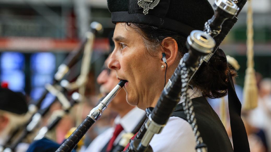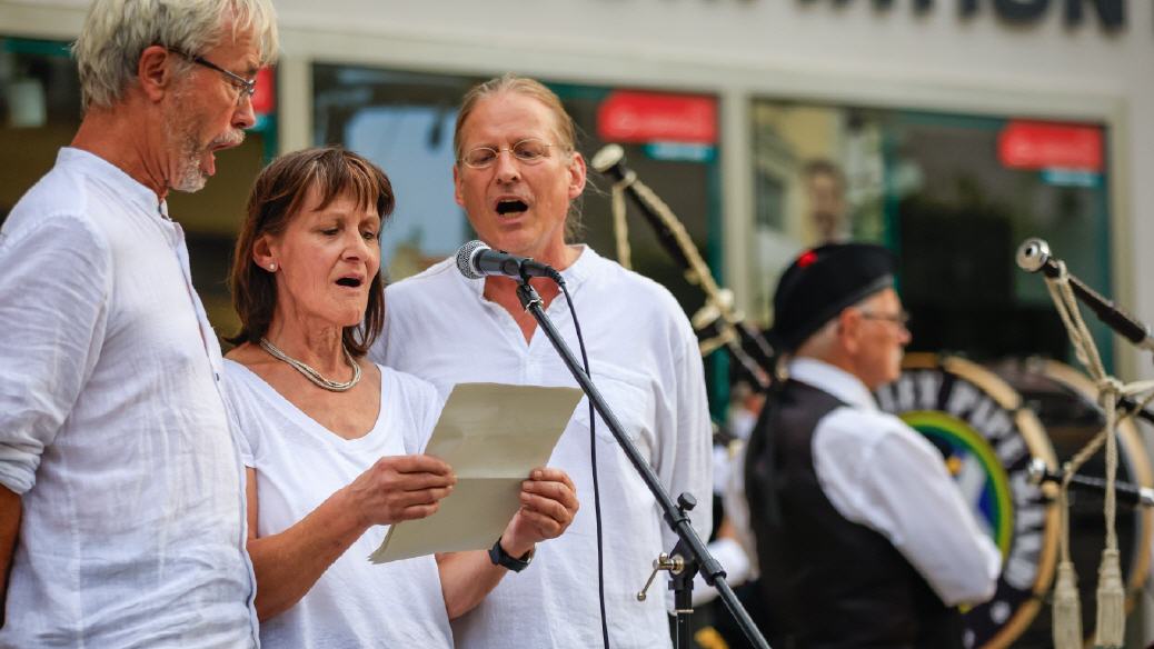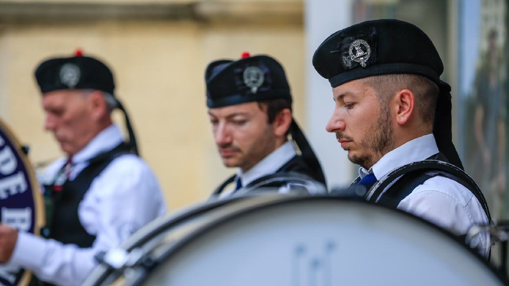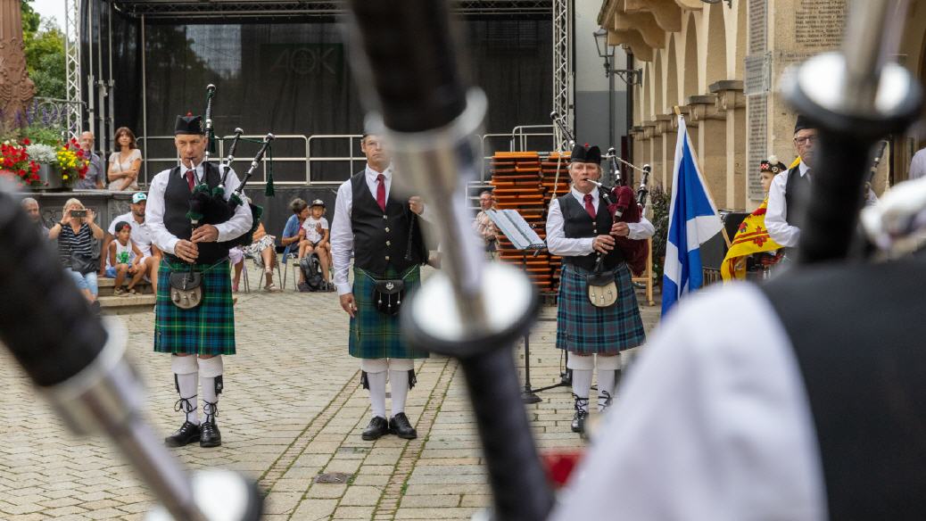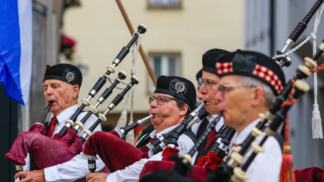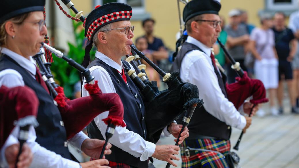 Einige unserer Musiker verstärkten die United Pipe Band bei einem Auftritt am 13. August in Singen. Bilder von Bernd Narr